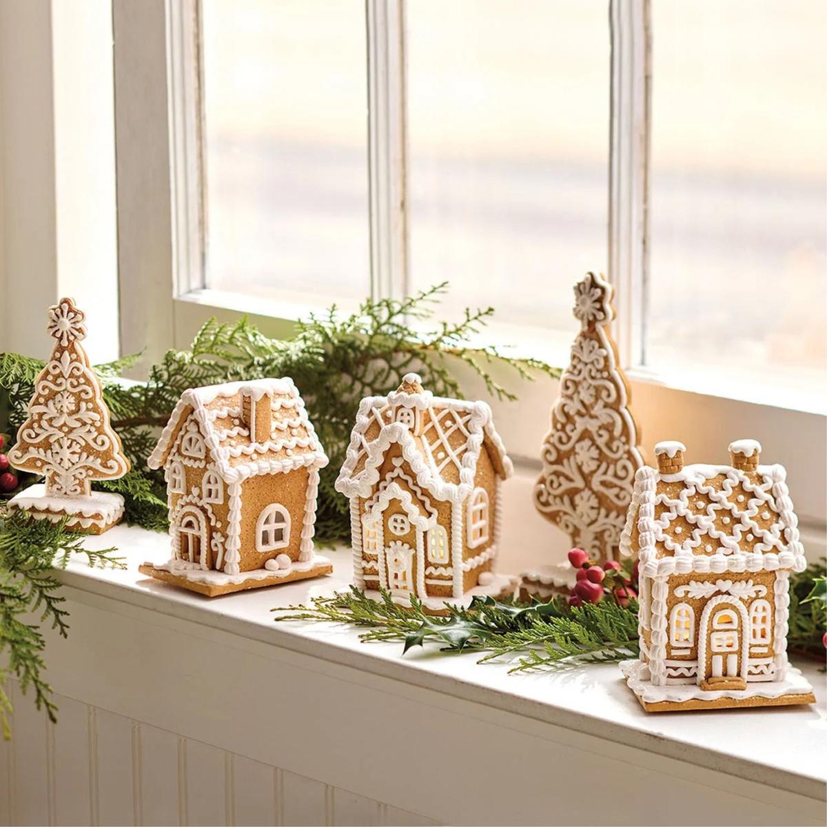 Welcome the holiday season with this charming set of five gingerbread houses and trees. Perfect for decorating the home, giving as gifts, or creating a festive centerpiece. Made with clay dough and expert craftsmanship, each piece is sure to impress. With this set, you'll have everything you need to add a touch of holiday cheer to your home. 4516765